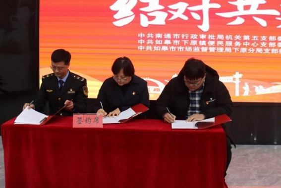 活动中,中共南通市行政审批局机关第五支部委员会、中共如皋市下原镇便民服务中心支部委员会、中共如皋市市场监督管理局下原分局支部委员会签订党建共建协议书,统筹整合三方优势资源,开展涉企服务。